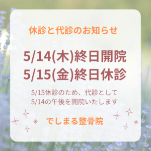 🍀5月の休診と代診のお知らせ🍀 2026.04.06 🍀5月の休診と代診のお知らせです🍀誠に勝手ながら、5/15(金)は休診いたします。その代わりといたしまして5/14(木)の午後を開院いたします。ご迷惑をおかけしますがどうぞよろしくお願いいたします。 4月の保育カレンダー 前の記事